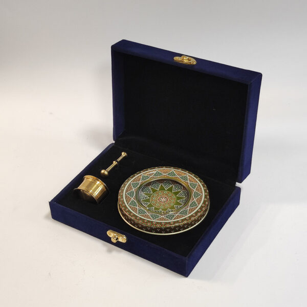 اجزای داخلی این محصول یک ظرف خاتم ۵ گرم و یک هاون کادویی هست که داخل آنرا میتوان با زعفران و هل یا گل محمدی پر کرد.