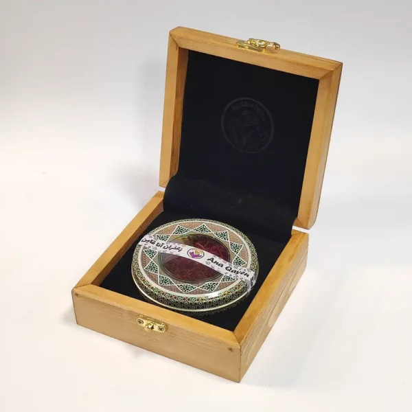 باکس چوبی ترمهای خیلی شیکیه؛ طراحیاش باعث میشه زعفرون داخلش مثل یه هدیه خاص بدرخشه.